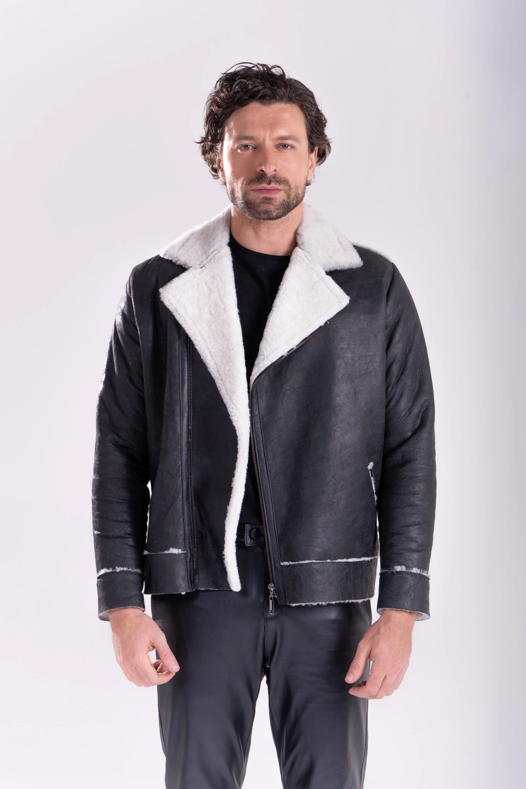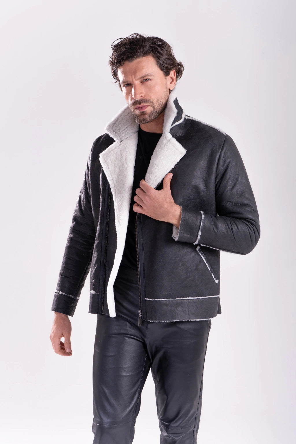 A jaqueta Gamulã Aviador, confeccionada em pele de ovelha italiana, é uma escolha impecável para enfrentar os dias frios com elegância e funcionalidade. Seu isolamento térmico natural retém o calor corporal de forma eficaz, enfrentando mesmo temperaturas negativas. A pele de ovelha bicolor, preta com interior branco traz exclusividade e os detalhes de acabamento em couro de cabra adicionam sofisticação. Experimente usar com a gola levantada para um toque de estilo.