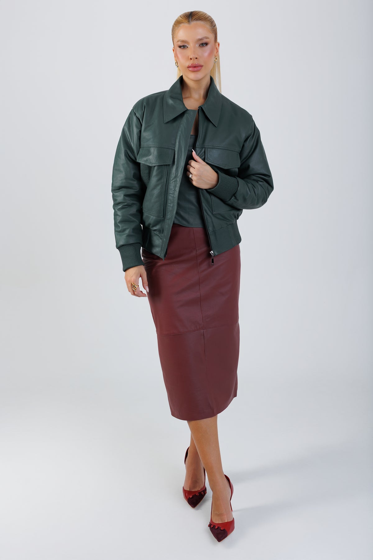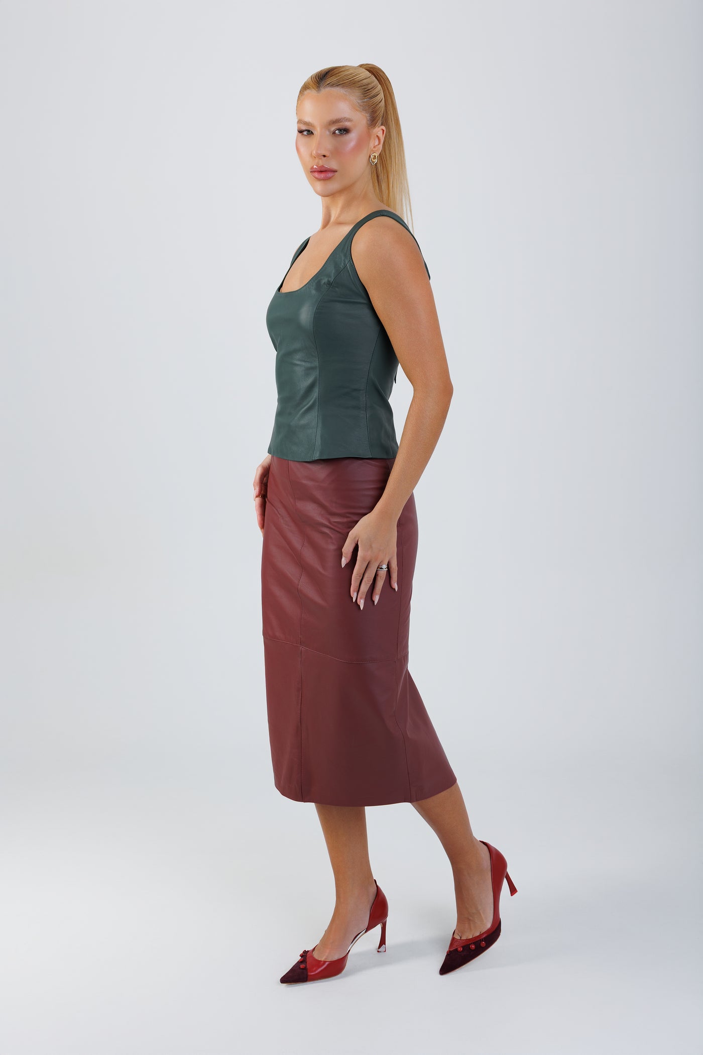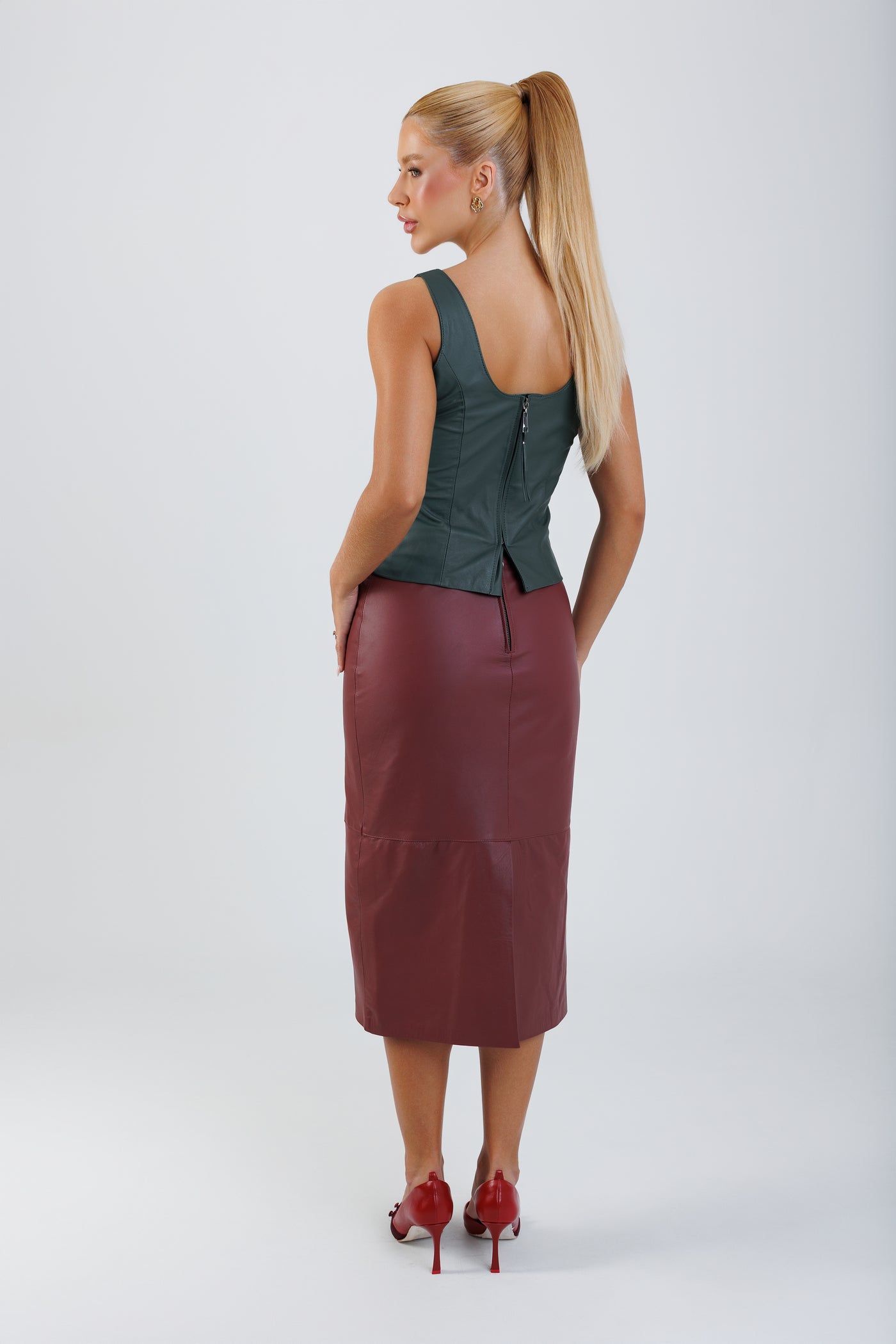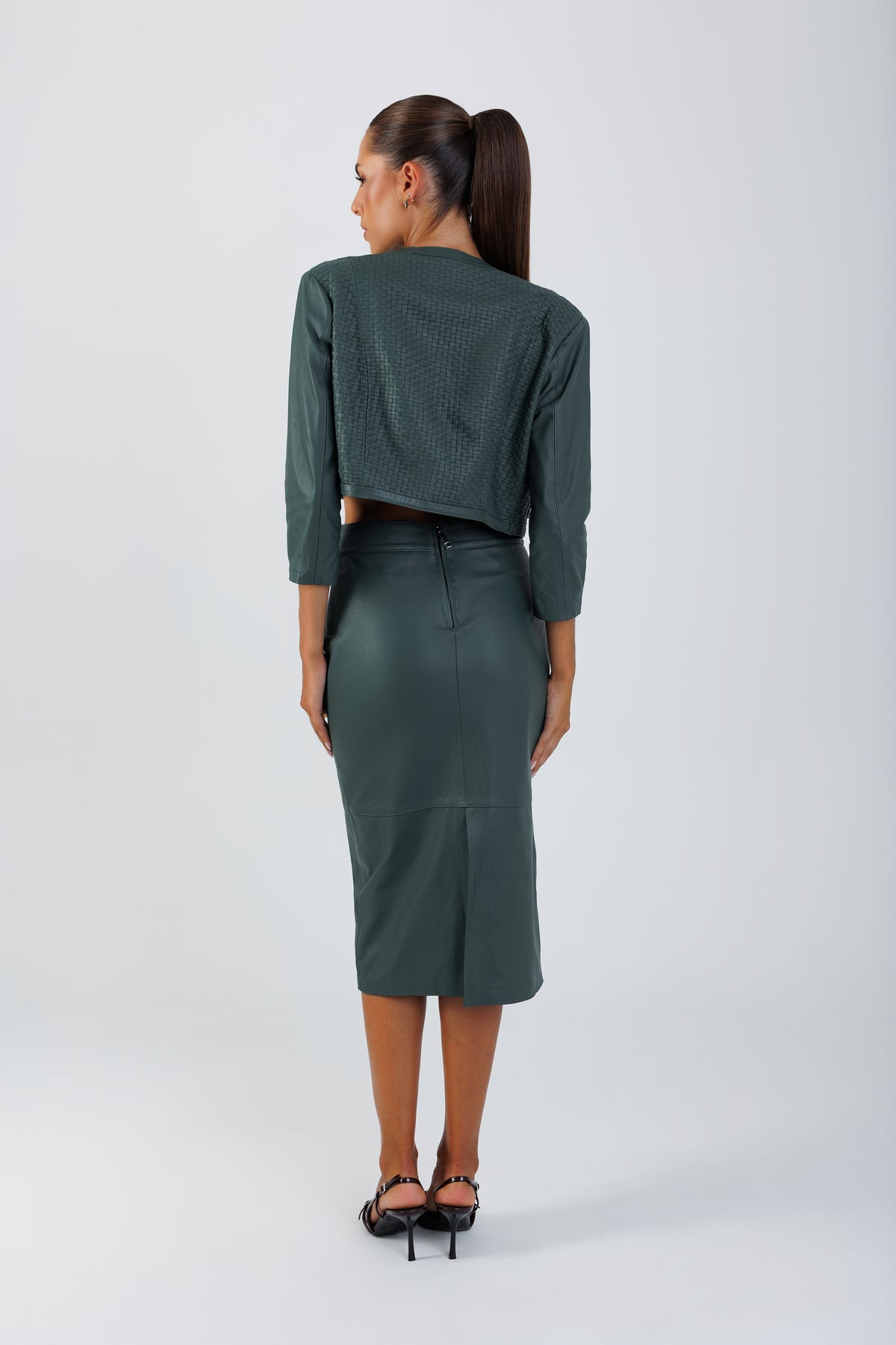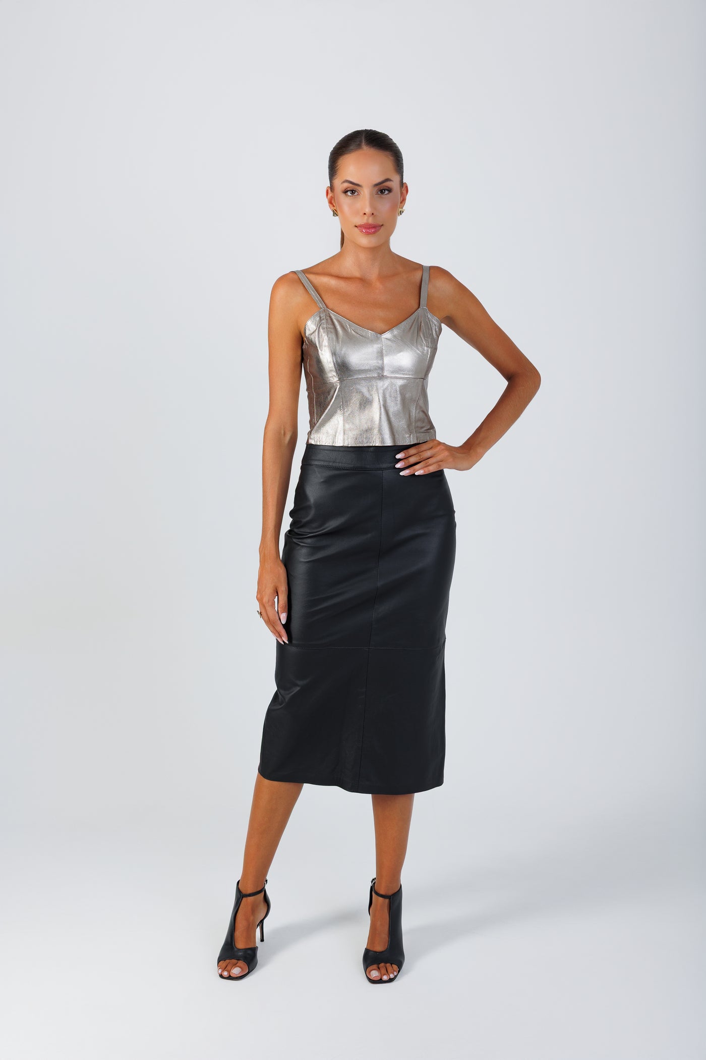 A Saia Lápis revisita um clássico da alfaiataria com a leveza do couro.