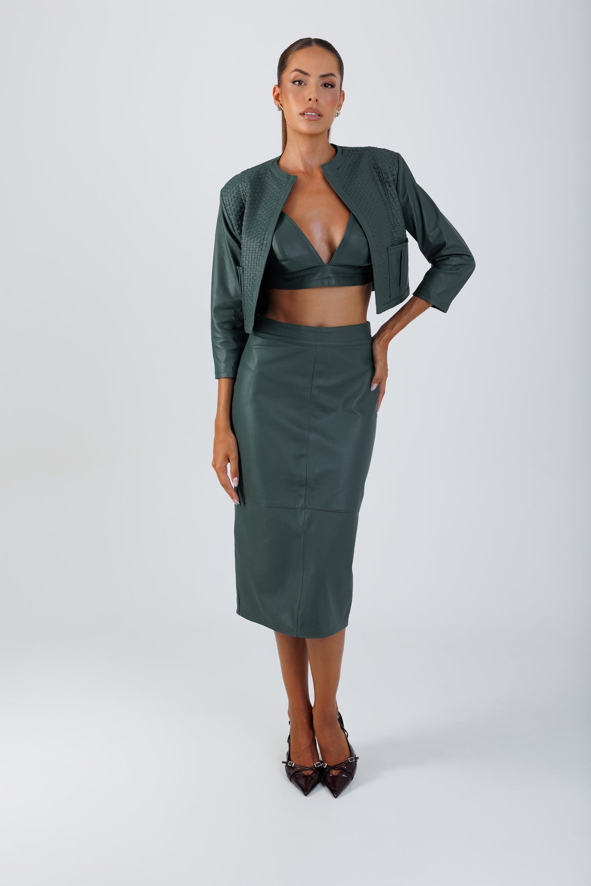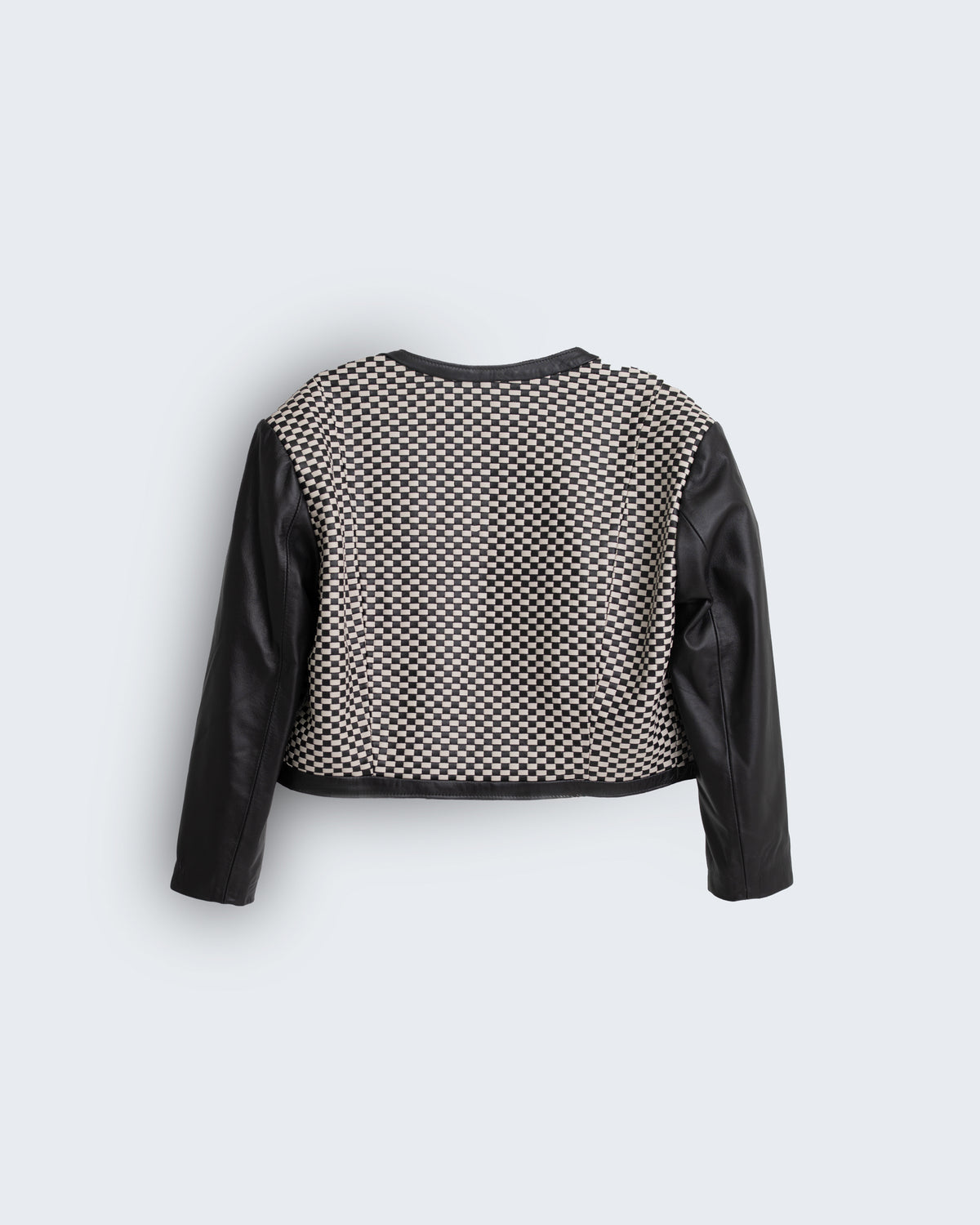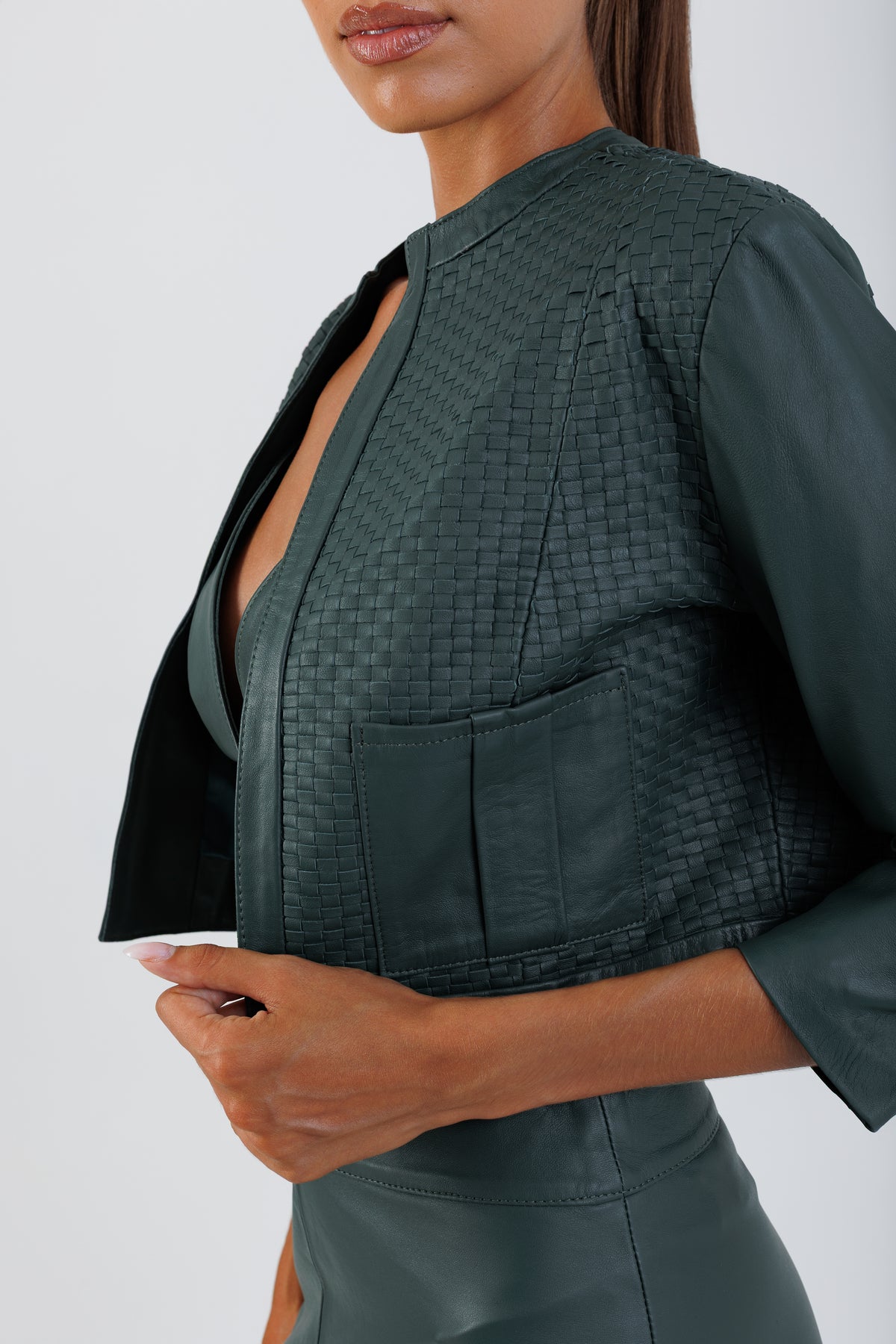 Com mangas 3/4 e ombros marcados, o Casaqueto Firenze – Tressê traduz a elegância atemporal sob uma perspectiva mais autoral e sofisticada. Confeccionado em couro com trabalho artesanal em trissê, a peça revela textura geométrica e profundidade visual que elevam o design clássico a um novo patamar de luxo contemporâneo.