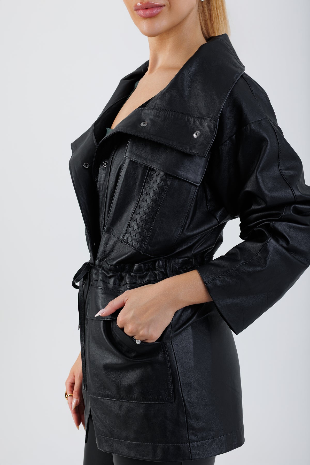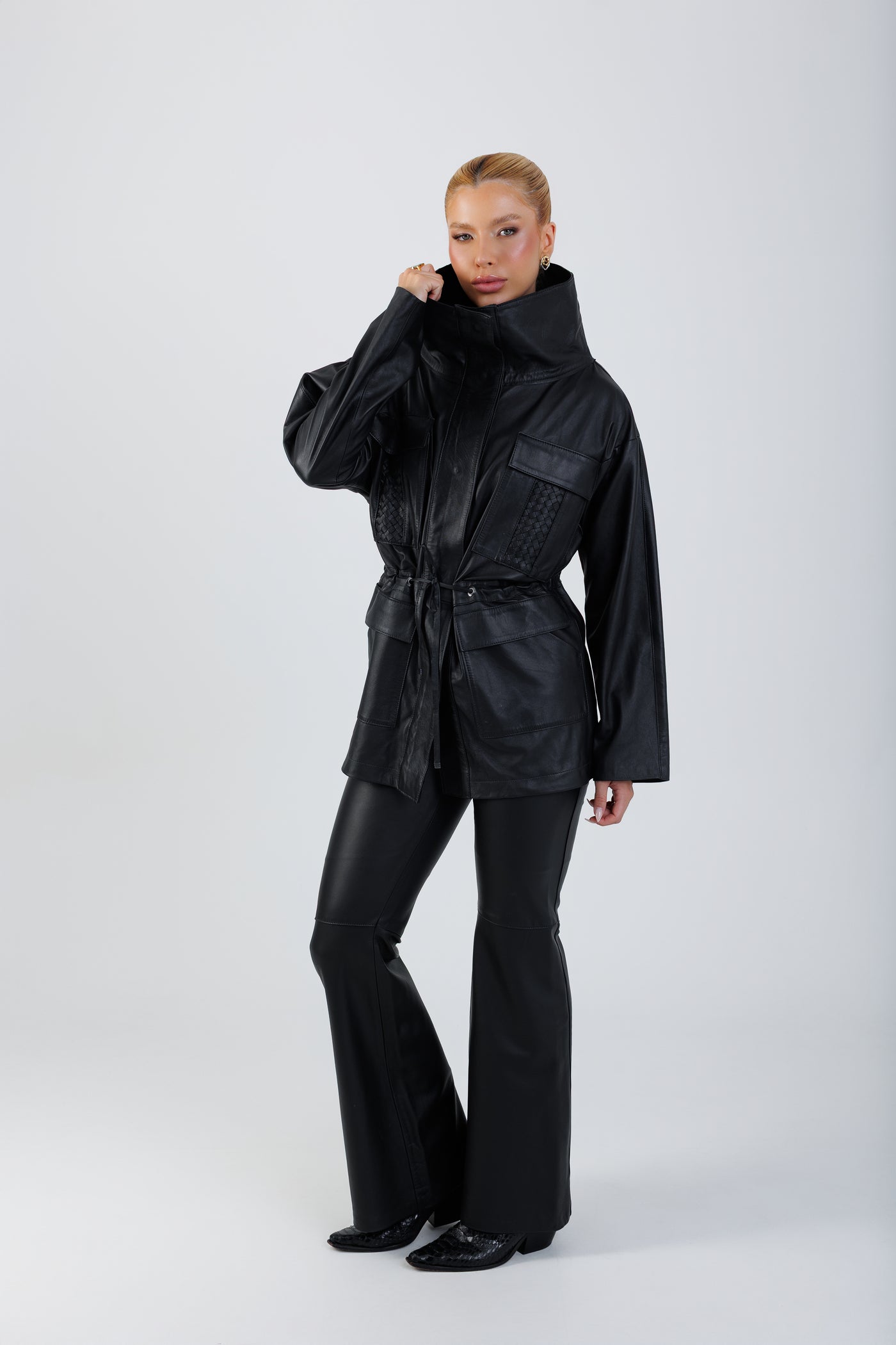 Disponível também na versão com bolso em couro tressé, que adiciona textura, profundidade visual e um toque autoral exclusivo ao design, elevando ainda mais o caráter sofisticado da parka.