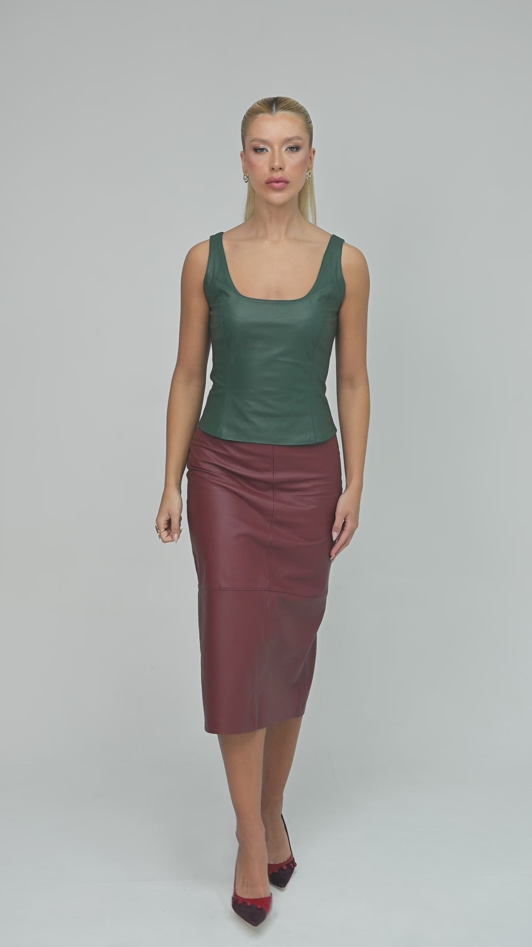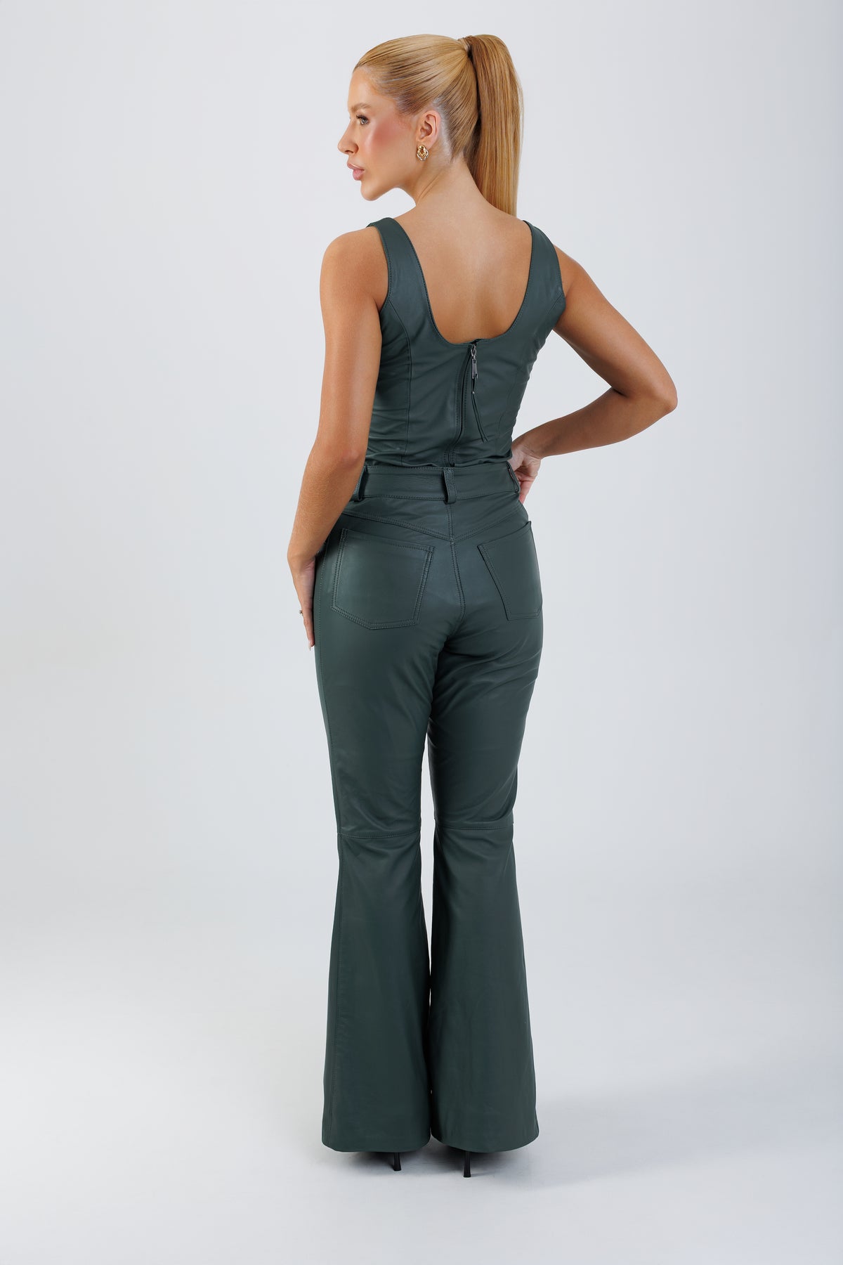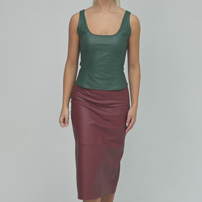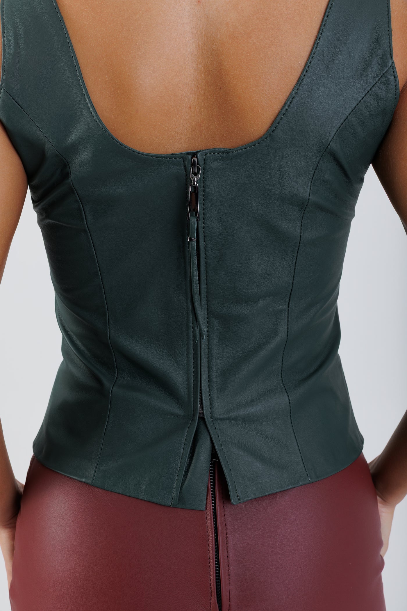 As alças largas reforçam a estrutura da peça e garantem sustentação visual, enquanto o fechamento posterior por zíper assegura praticidade e acabamento sofisticado. A construção precisa transforma a regata em uma base poderosa para composições minimalistas ou produções.