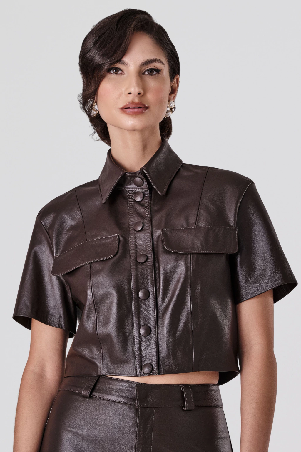 Feita em couro legítimo de toque macio e estrutura firme, a Camisa Cropped Istambul traduz o poder do minimalismo em sua forma mais sofisticada. O design apresenta lapelas com bolsos decorativos, botões frontais forrados e acabamento preciso, refletindo a estética utilitária elevada que domina o luxo urbano contemporâneo.