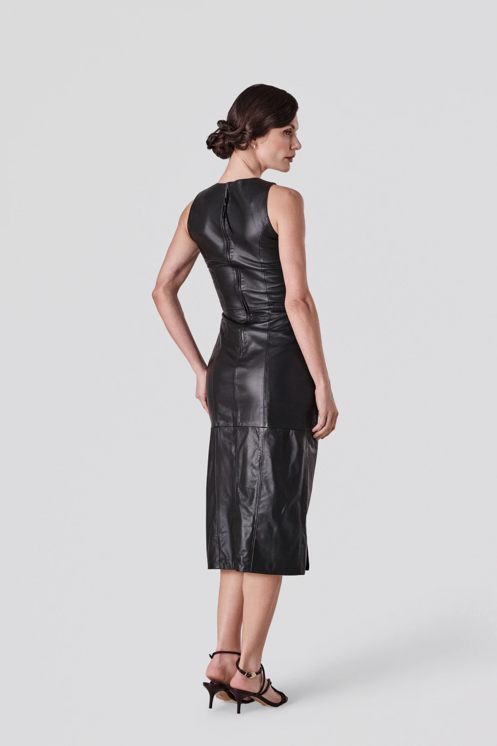Vestido em pelica [couro de cabra] sem mangas para aqueles dias mais quentes e também meia estação, o comprimento curto na medida certa. Seu design com a gola ajustada em V e acabamento impecáveis que valorizam seu look. Os recortes valorizam o corpo e garantem conforto prolongado para usar o dia todo. Essa peça é aquela must have do guarda roupa coringa, um básico, que permite multi composições e se adapta ao seu estilo.