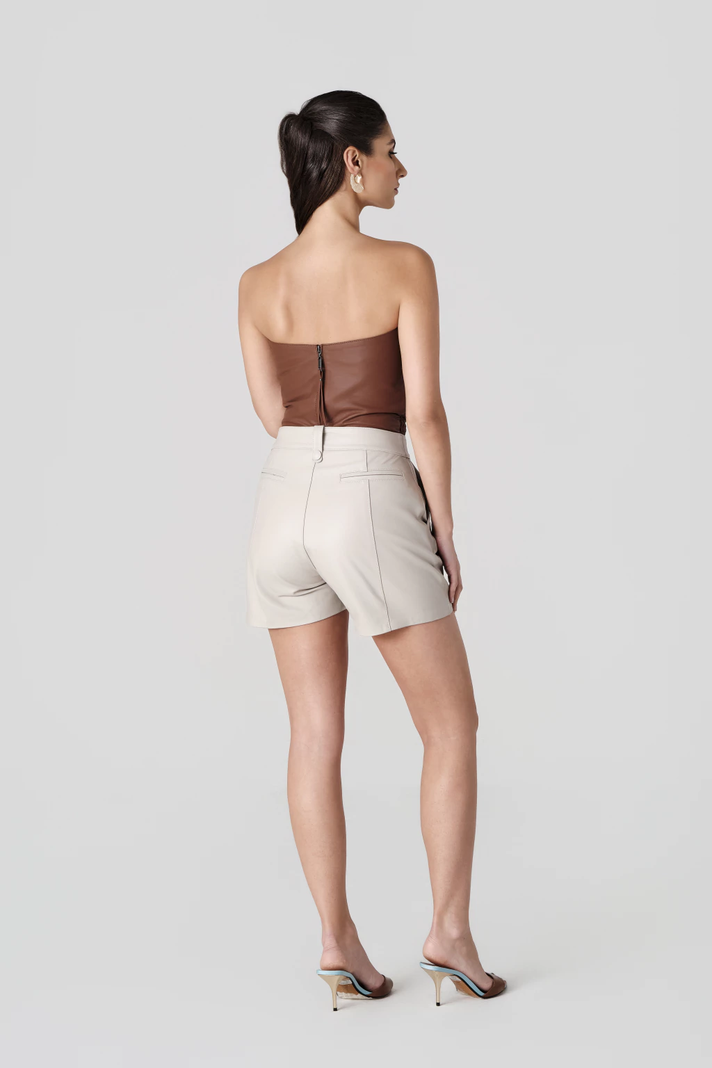 Em couro pelica com textura matelassada, a peça combina estrutura e delicadeza, destacando o shape tomara que caia como protagonista. O zíper posterior reforça o caimento impecável, enquanto o forro com elastano garante conforto e liberdade de movimento.